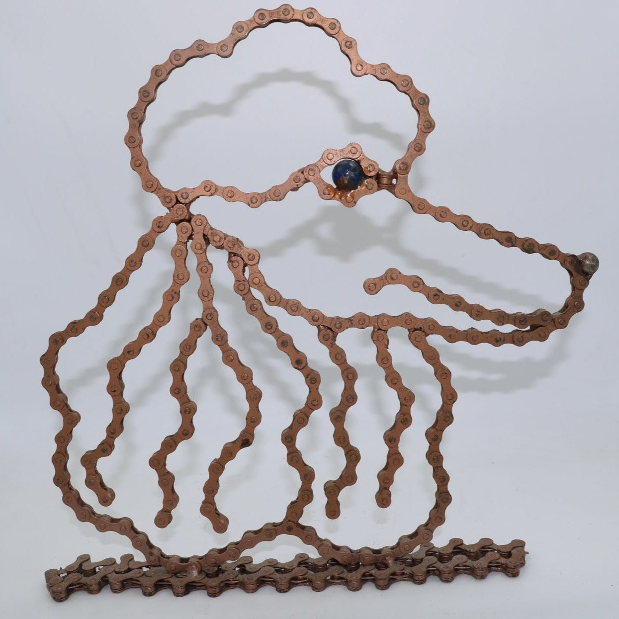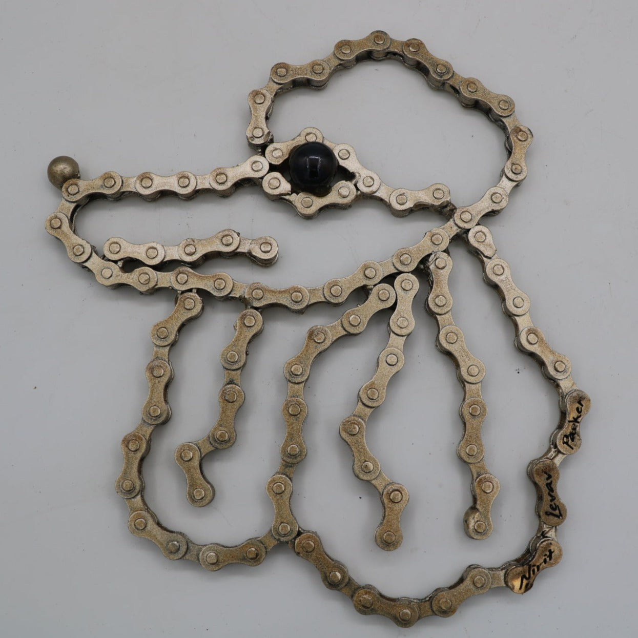 The sculpture is made of clean and painted bicycle chains
