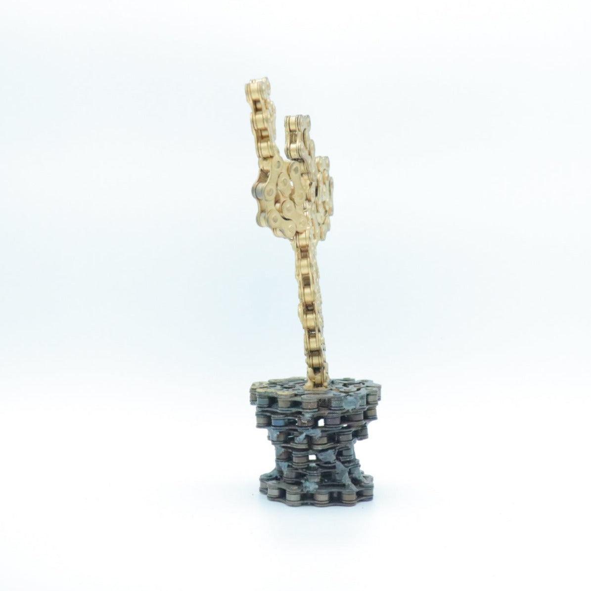 The sculpture is made of clean and painted bicycle chains.