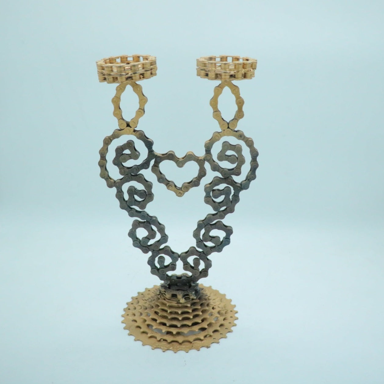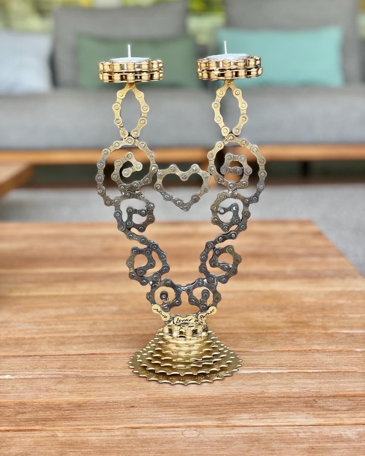The sculpture is made of clean and painted bicycle parts, usable for lighting candles.
