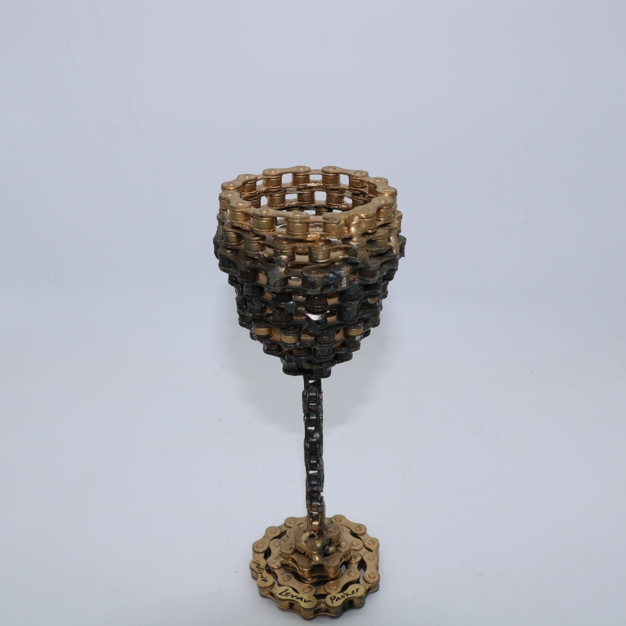 The Glass Of Wine sculpture is made of clean and painted bicycle chains.