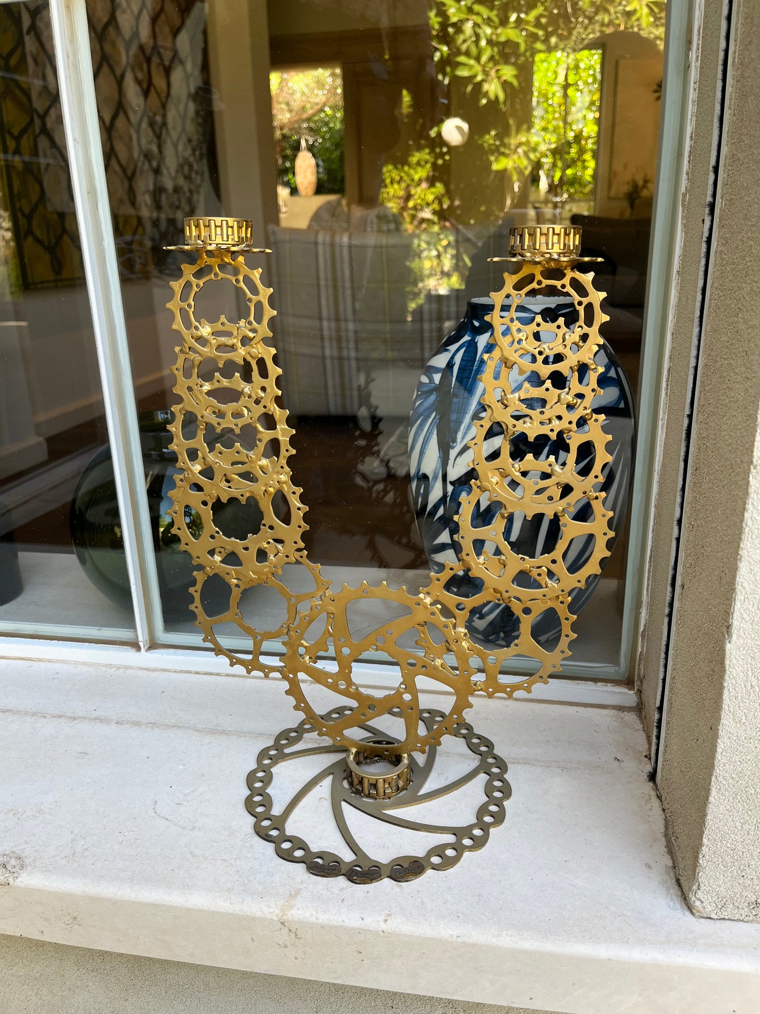The sculpture is made of clean and painted bicycle parts, usable for lighting candles.