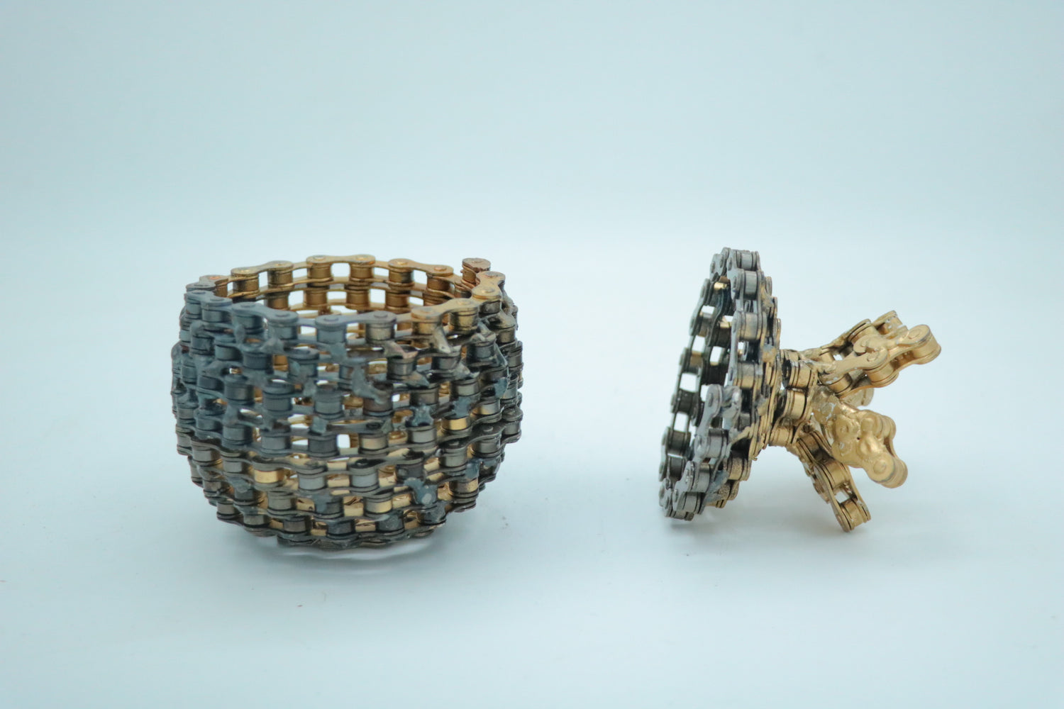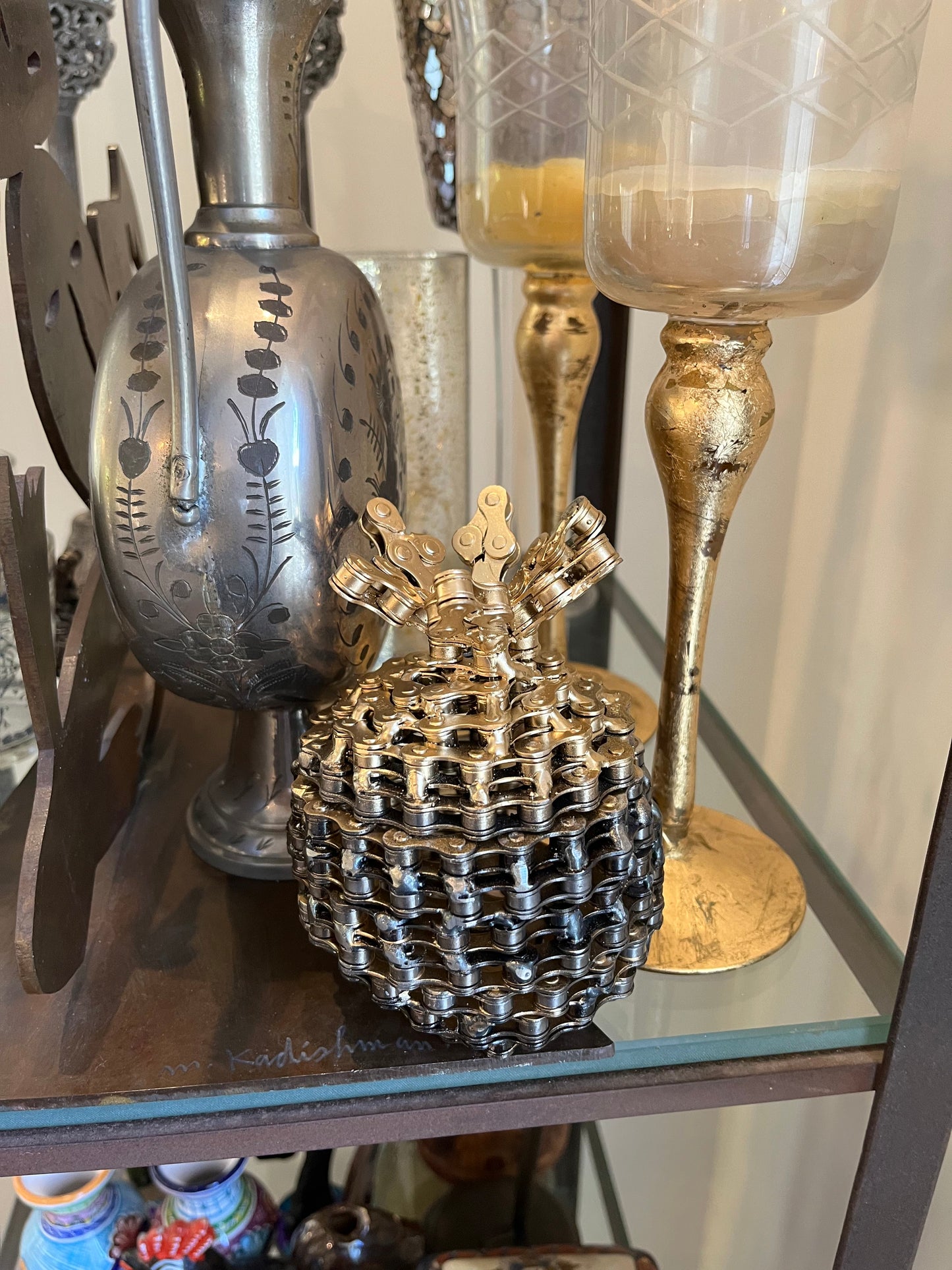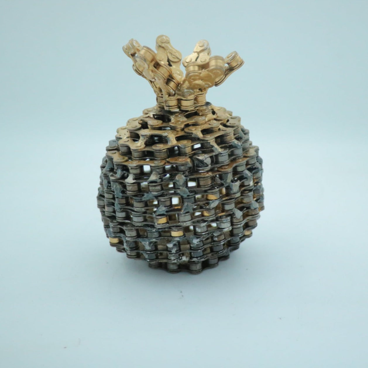 The Solid Pomegranate sculpture is made of clean and painted bicycle chains.