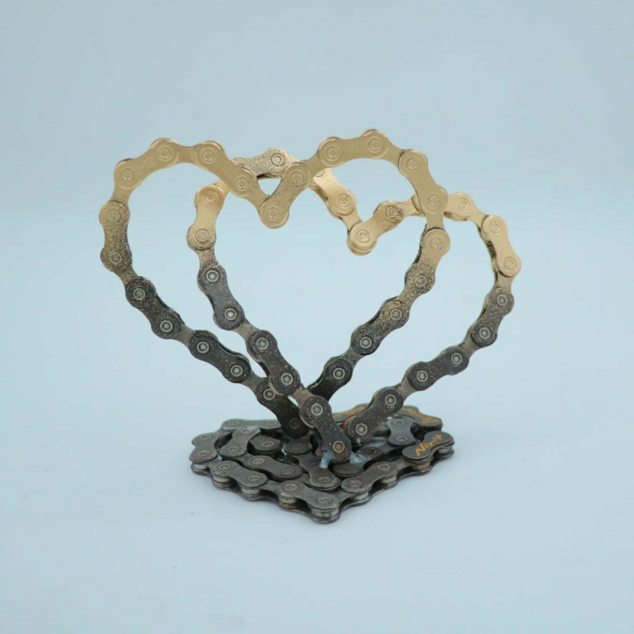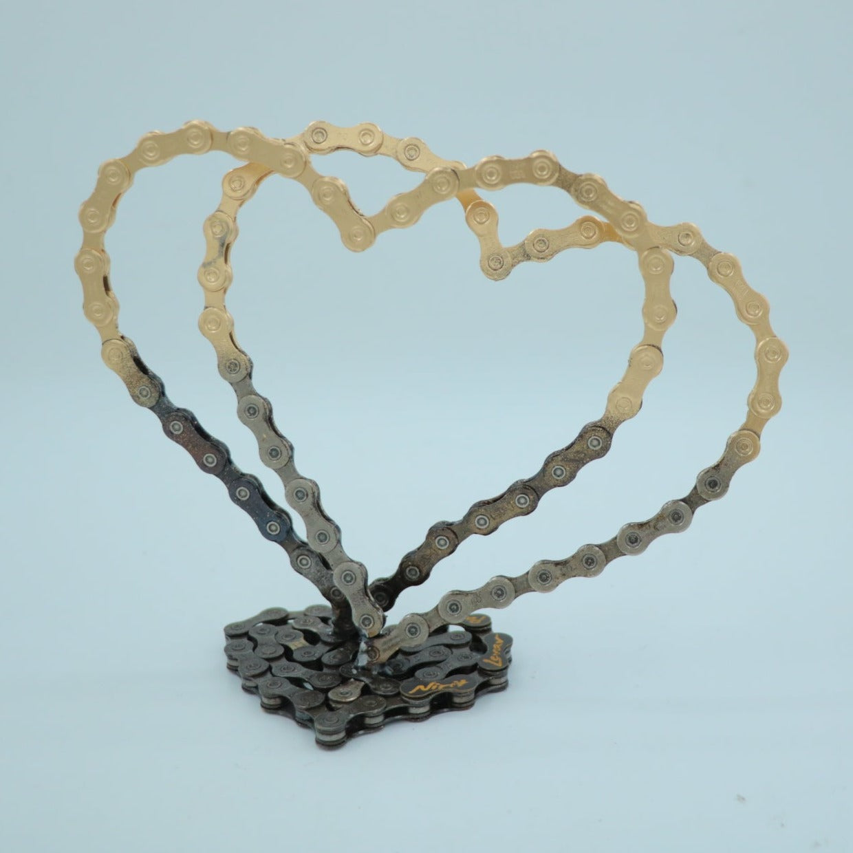 The sculpture is made of clean and painted bicycle chains.
