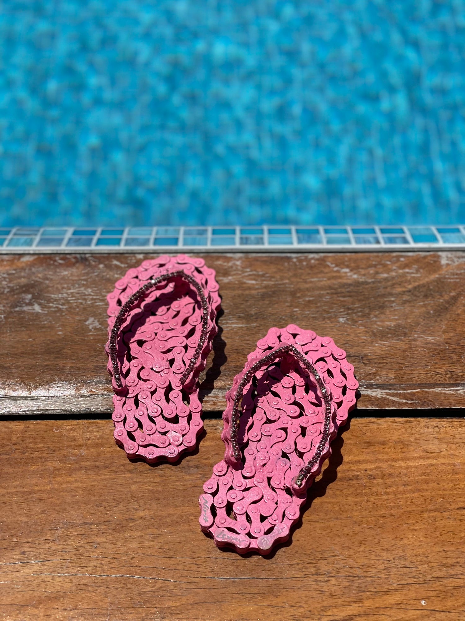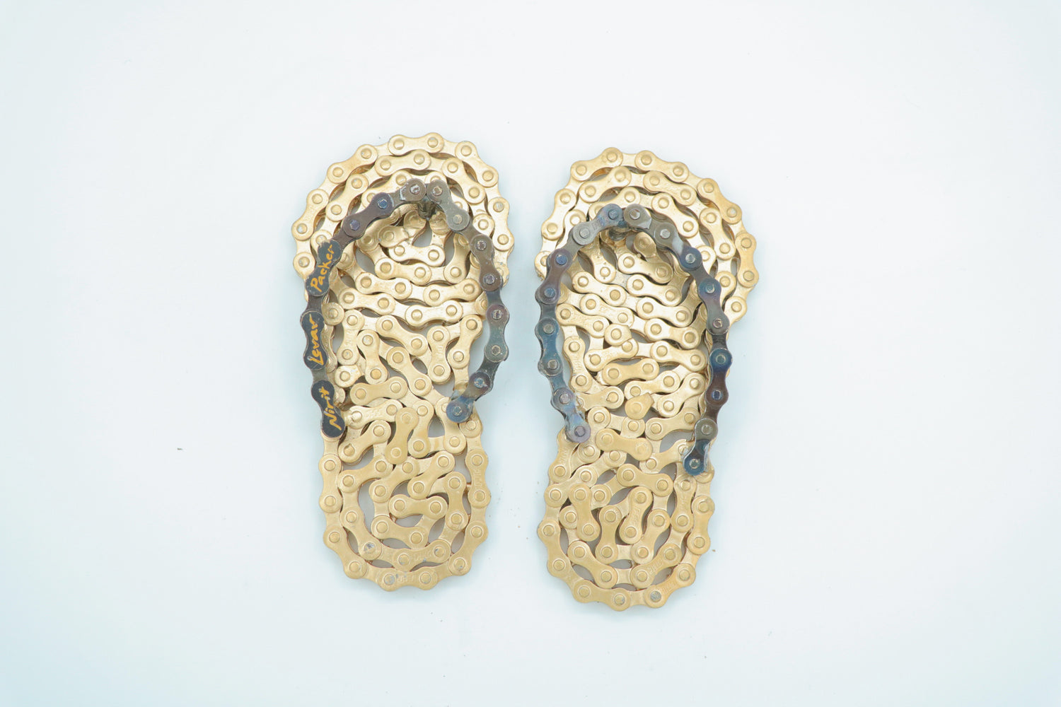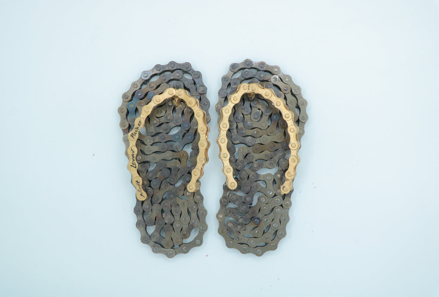 The sculptures are made of clean and painted bicycle chains.