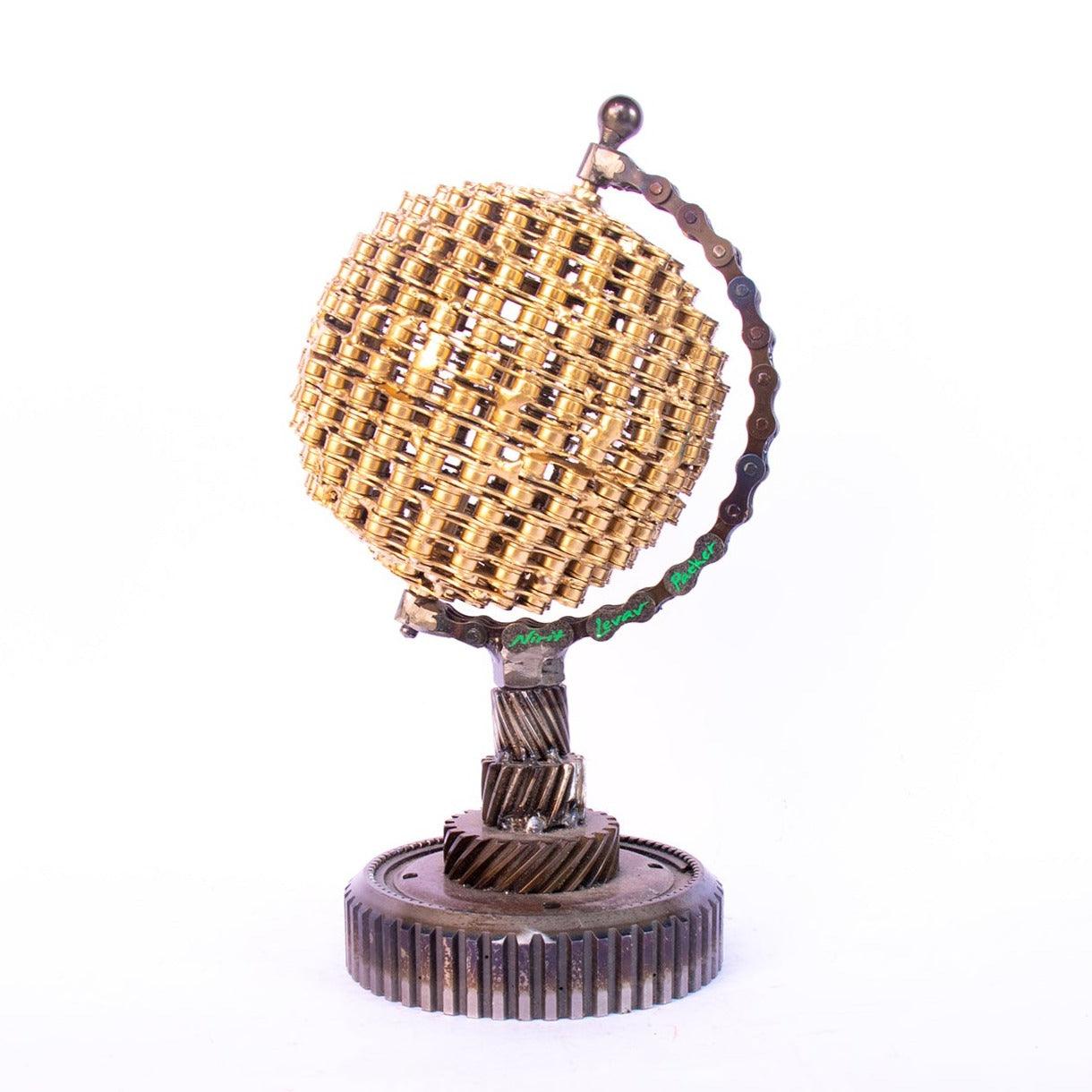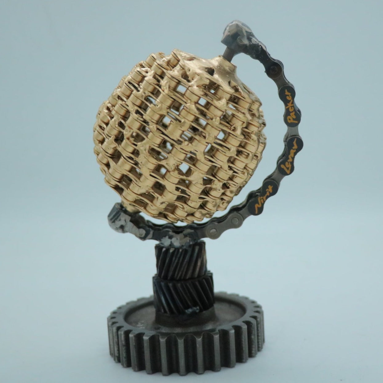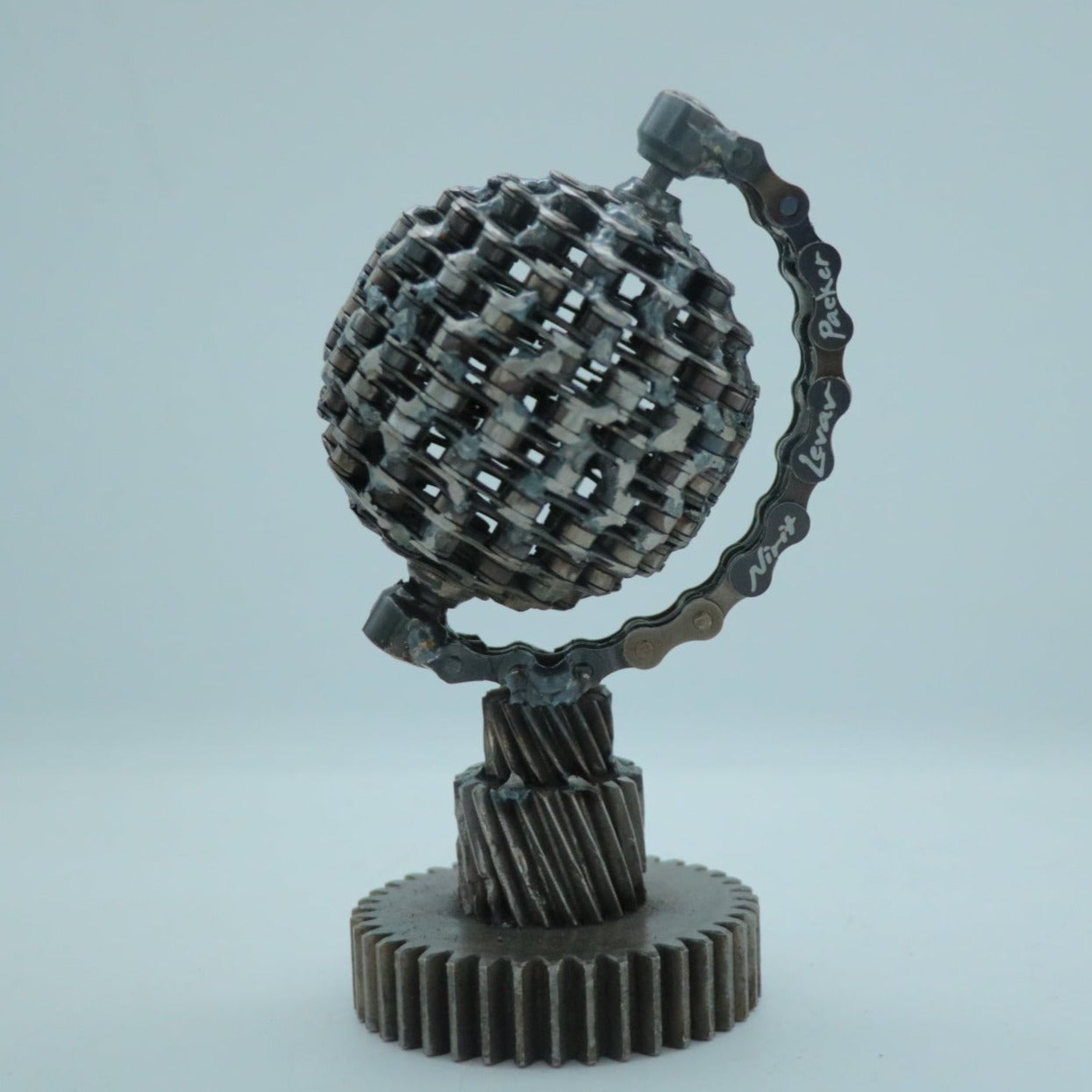 A small unique bike art of a globe made of clean and painted bicycle chains