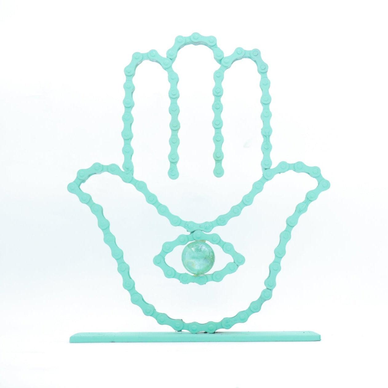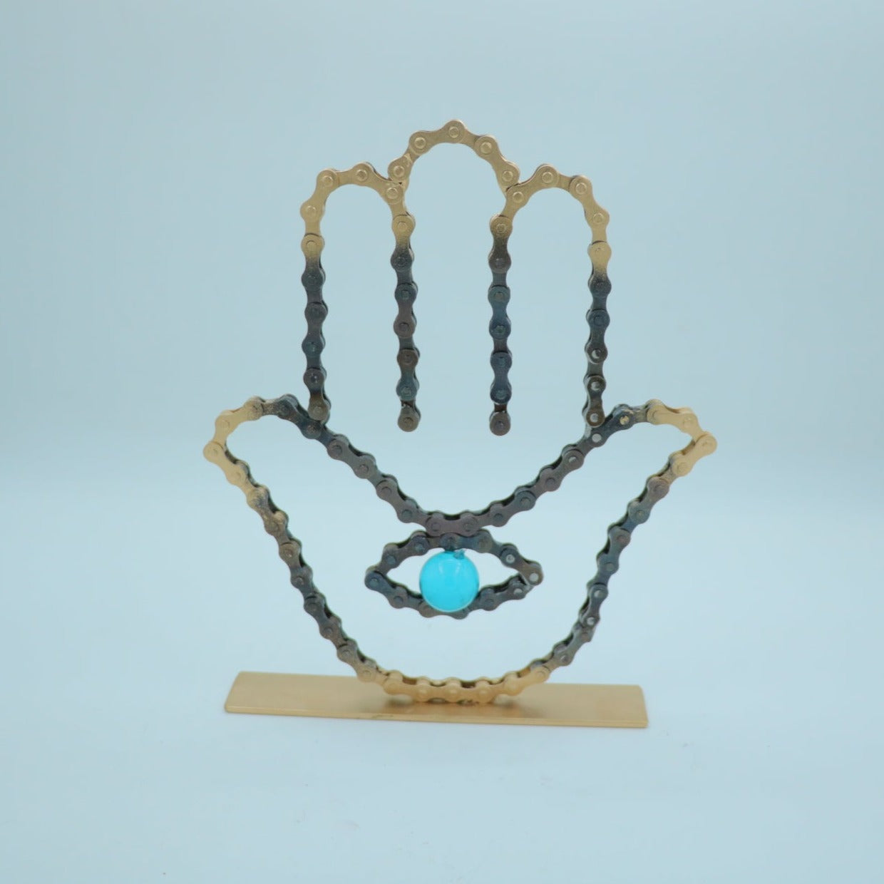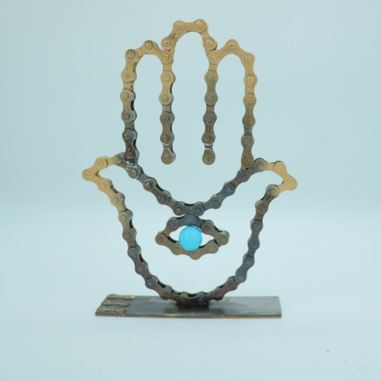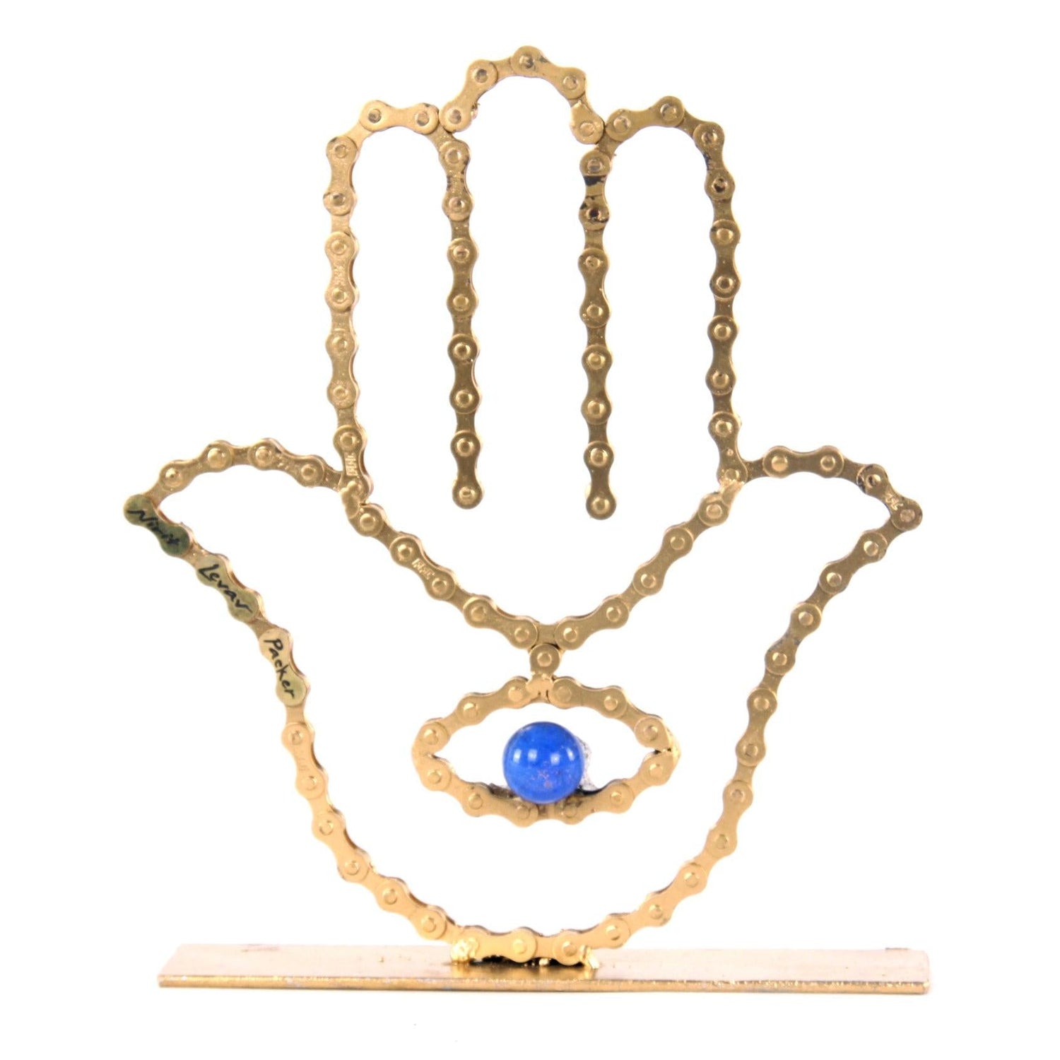 The hamsa sculpture of a metal palm-shaped amulet captures a sense of peace and protection for the home.