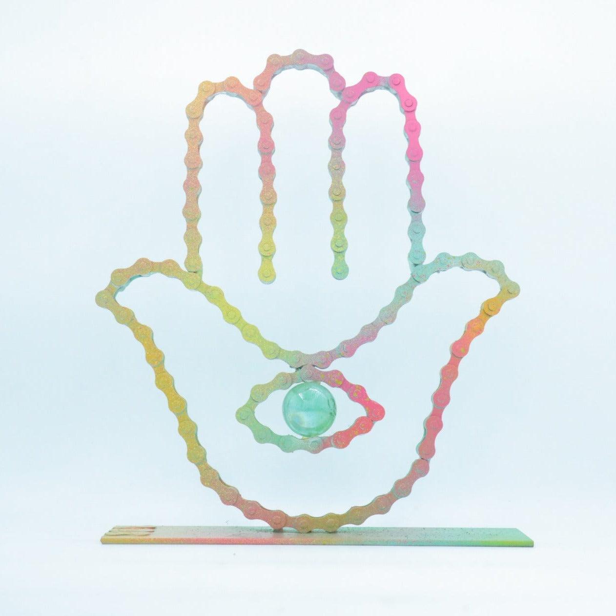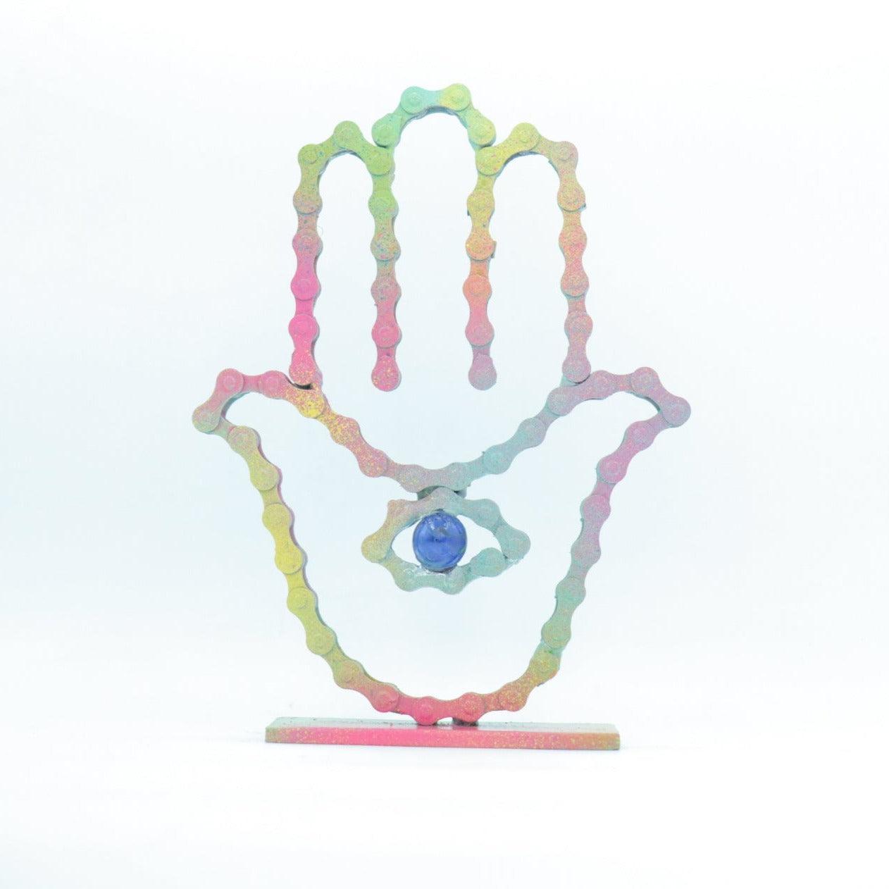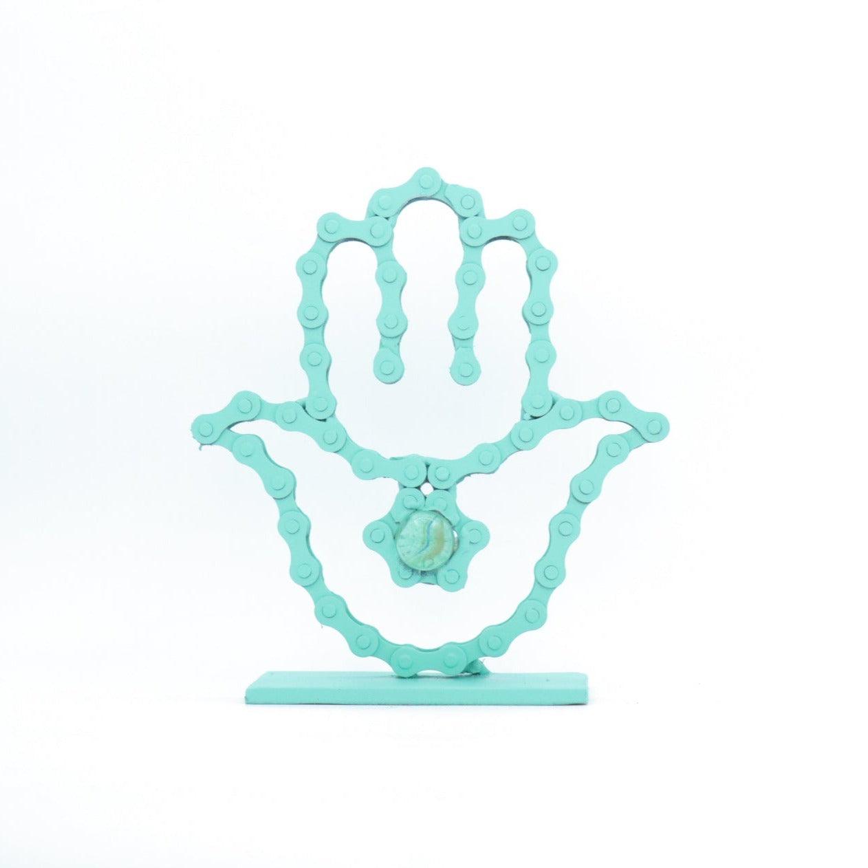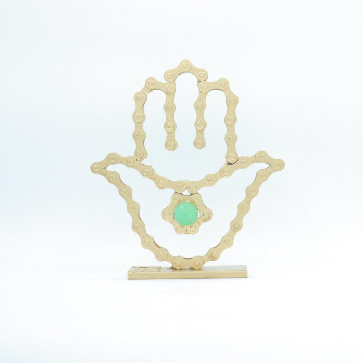 The hamsa sculpture of a metal palm-shaped amulet captures a sense of peace and protection for the home.