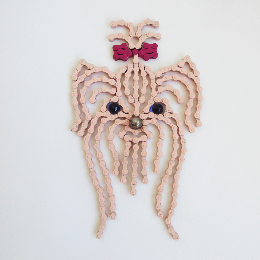 The sculpture is made of clean and painted bicycle chains