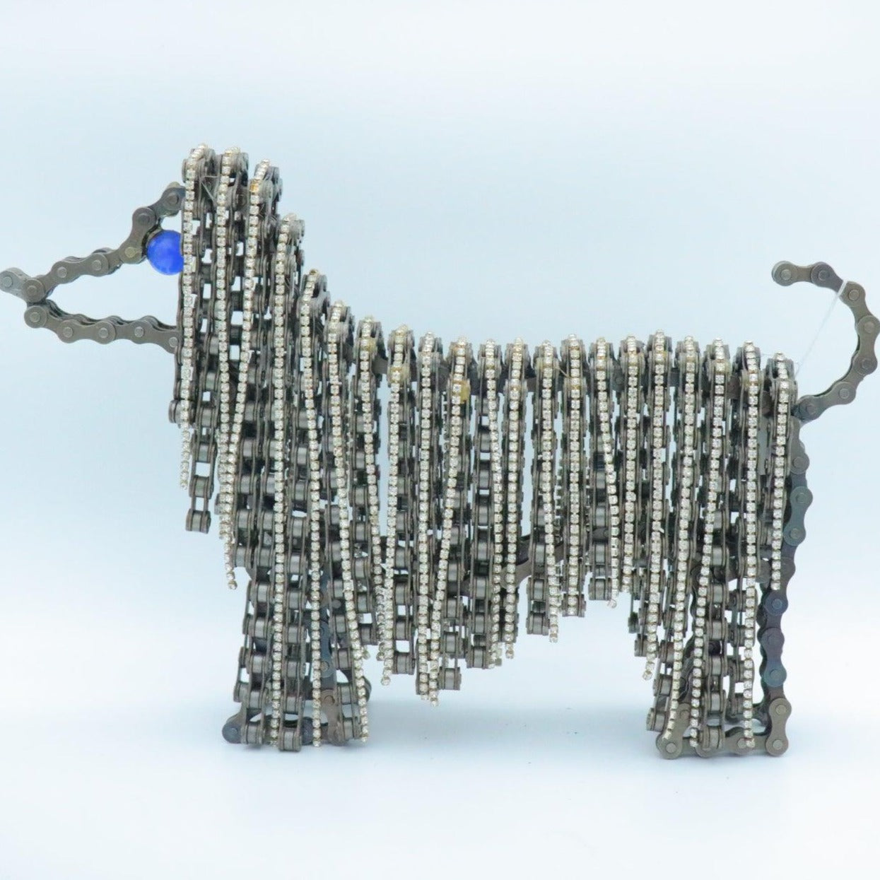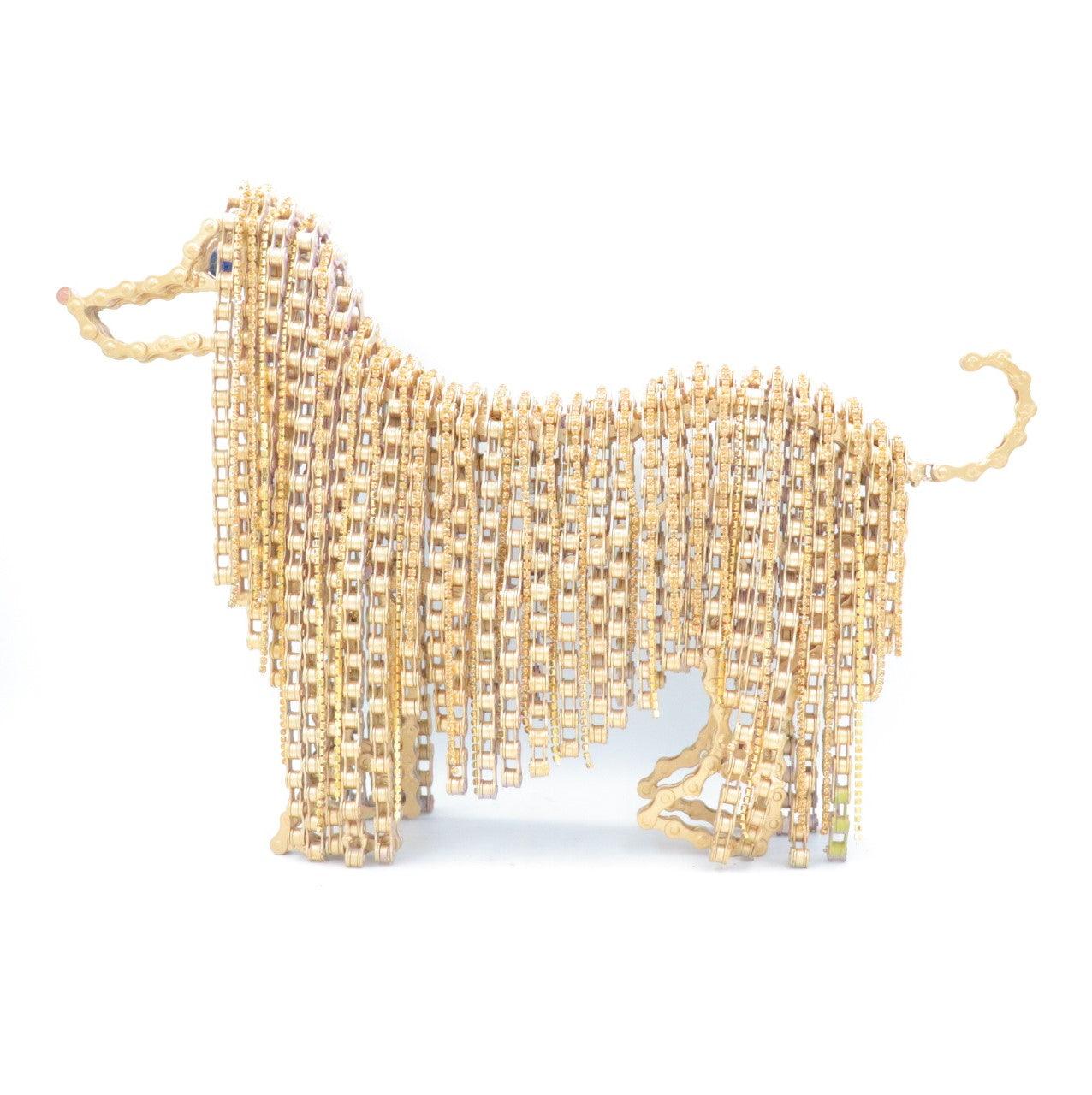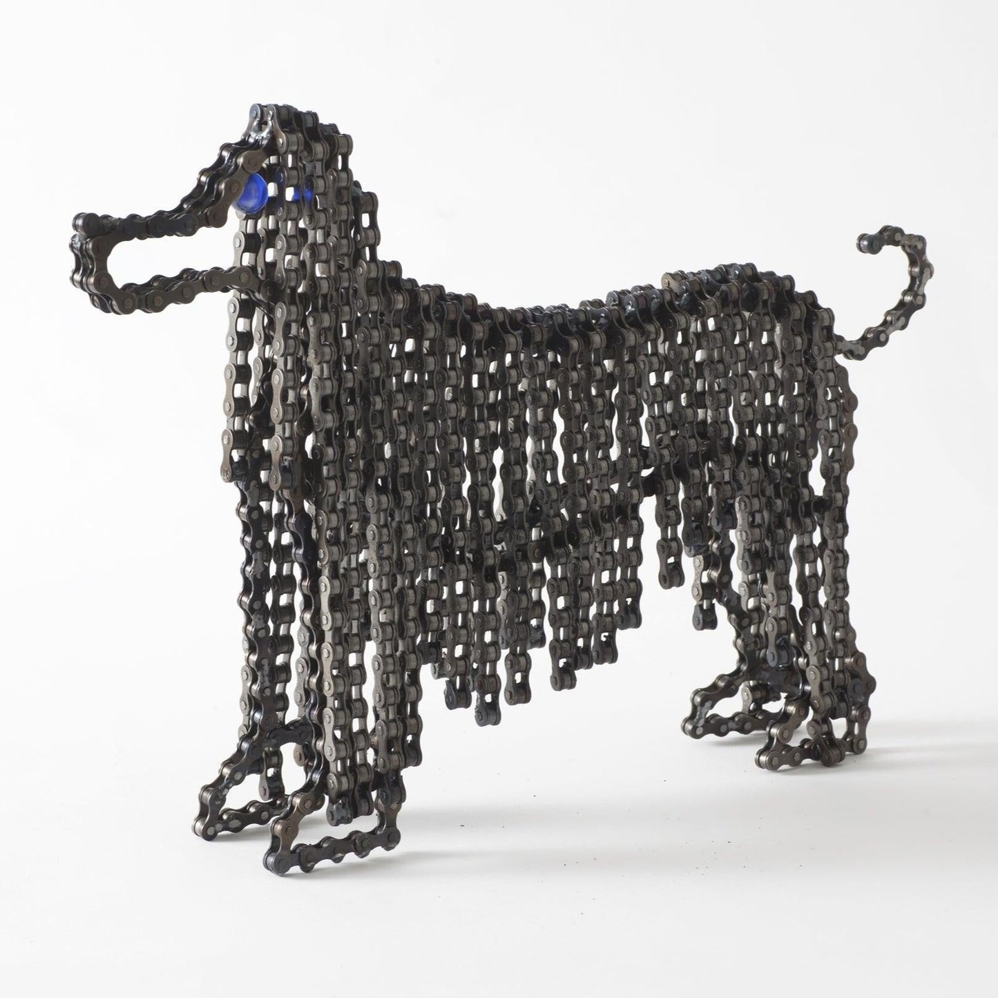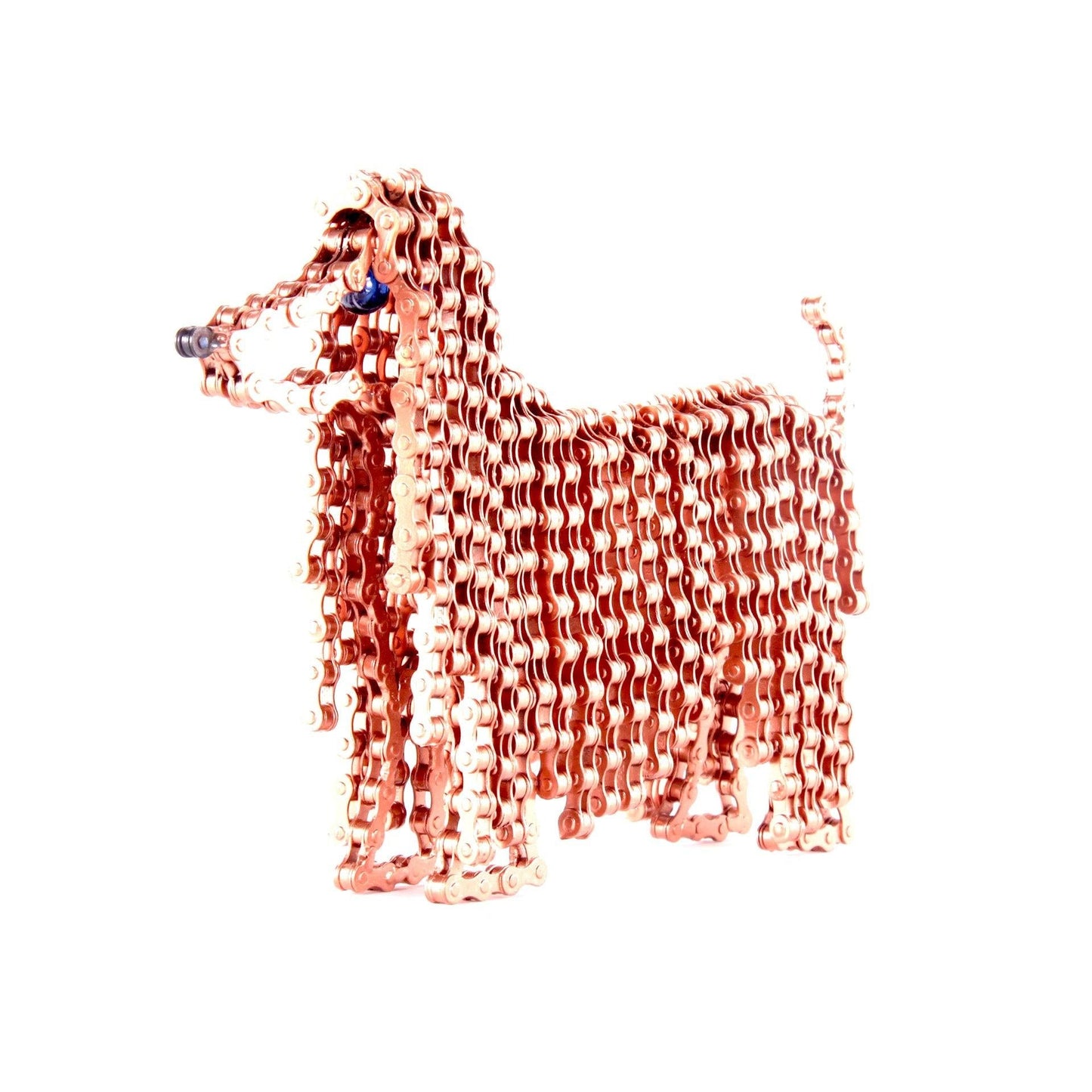 A modern art sculpture of a standing Afghan Hound dog with marble eyes.