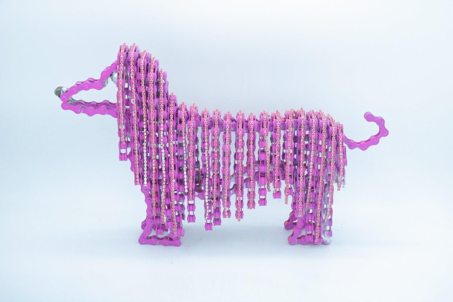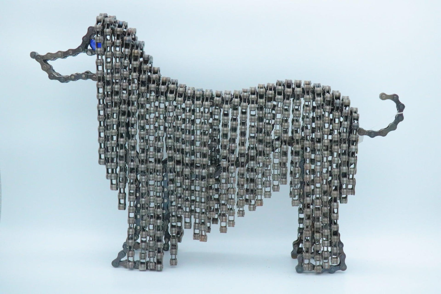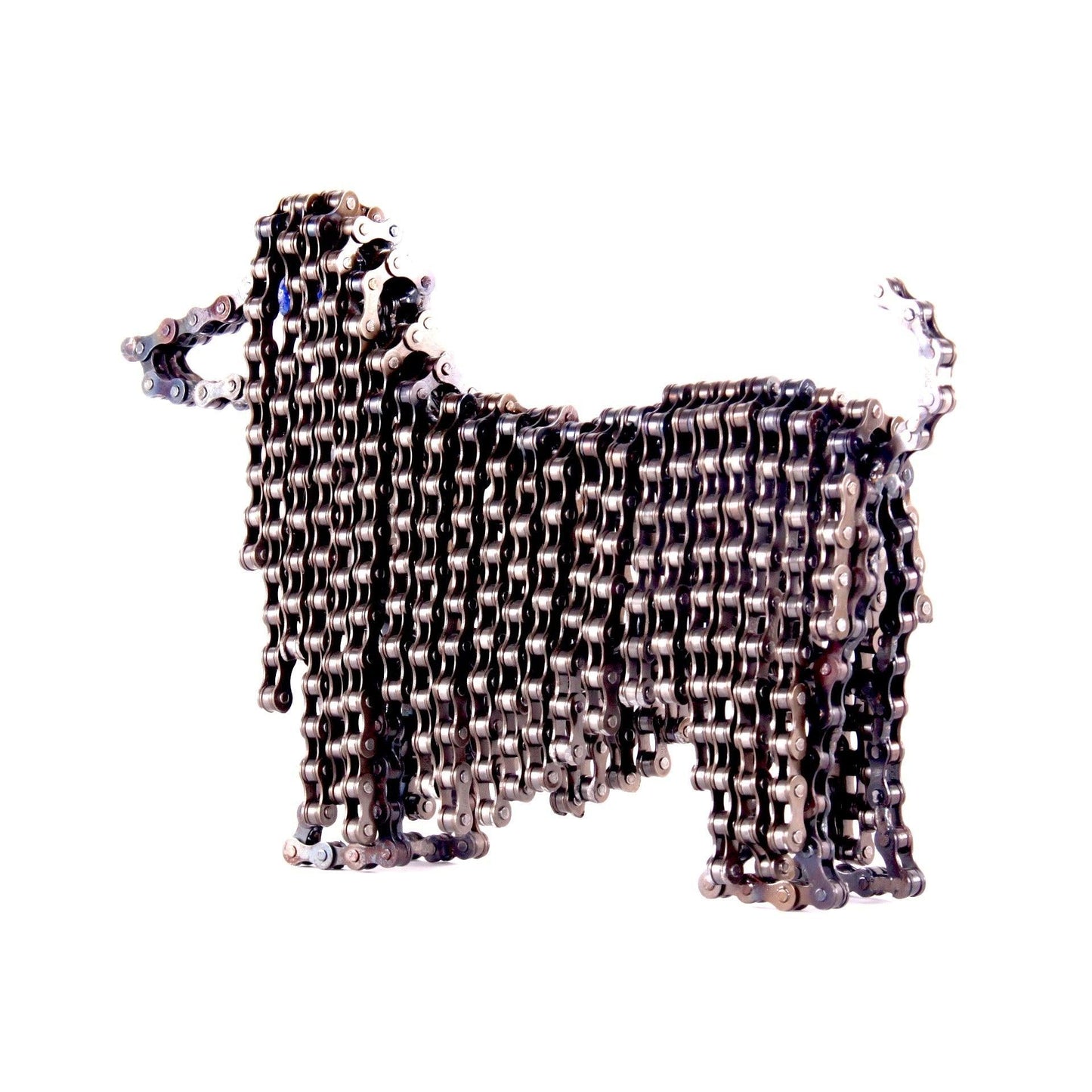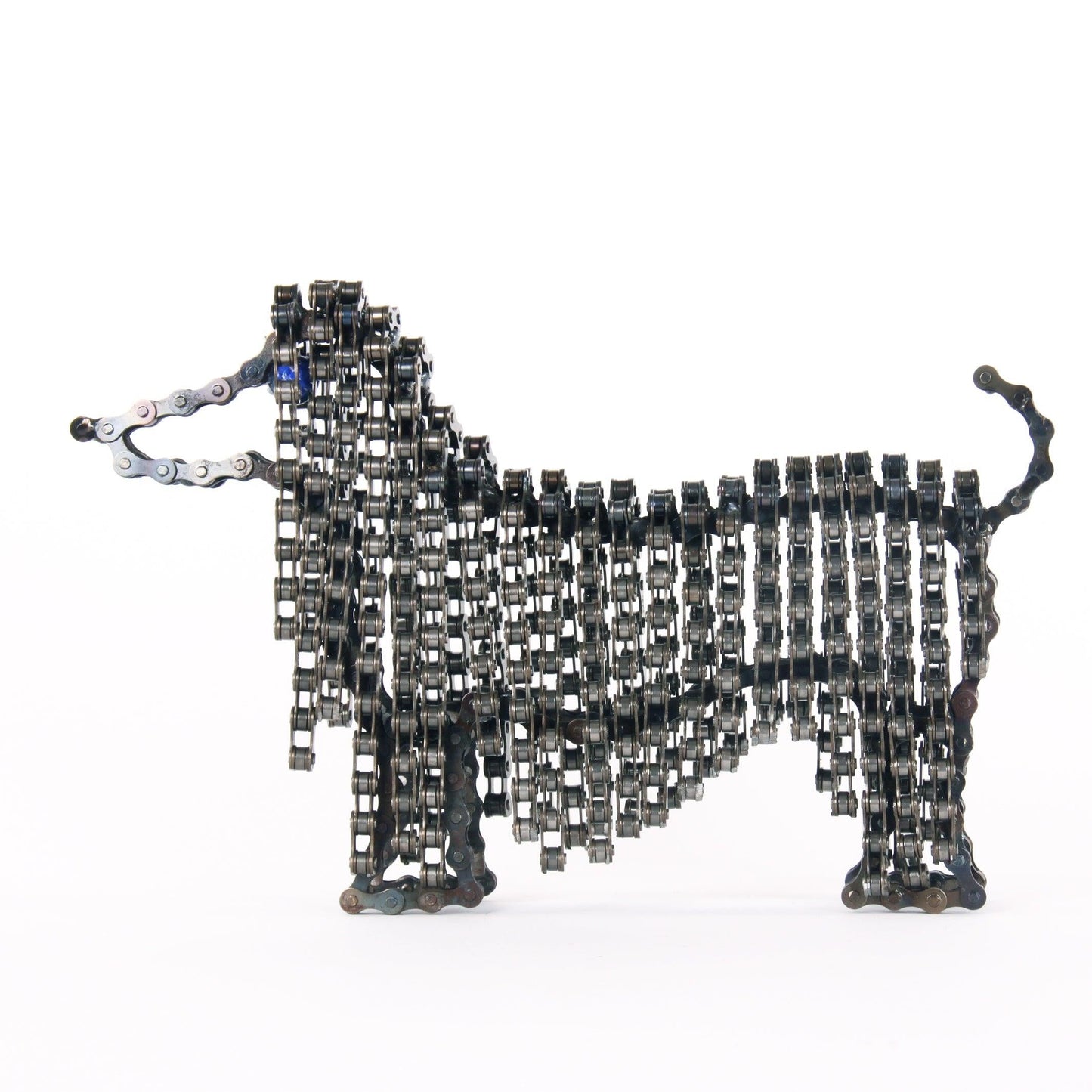 A modern art sculpture of a standing Afghan Hound dog with marble eyes.
