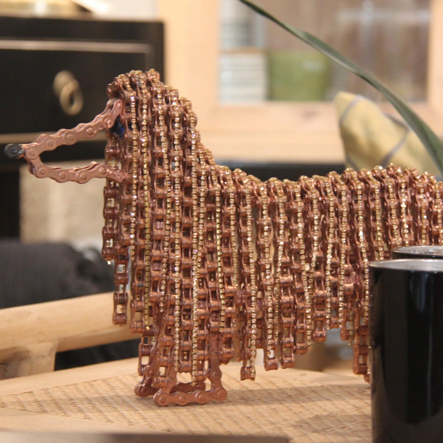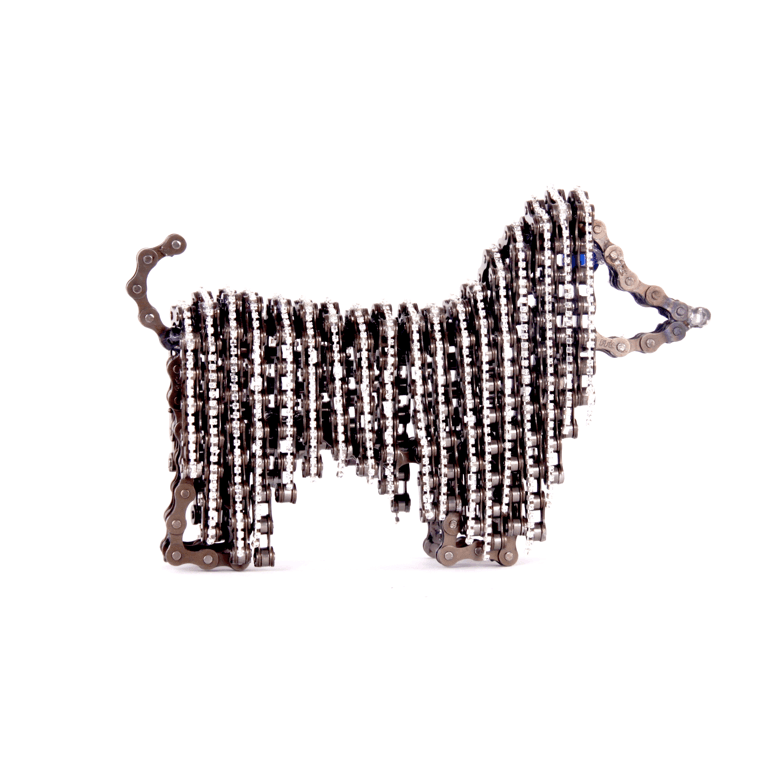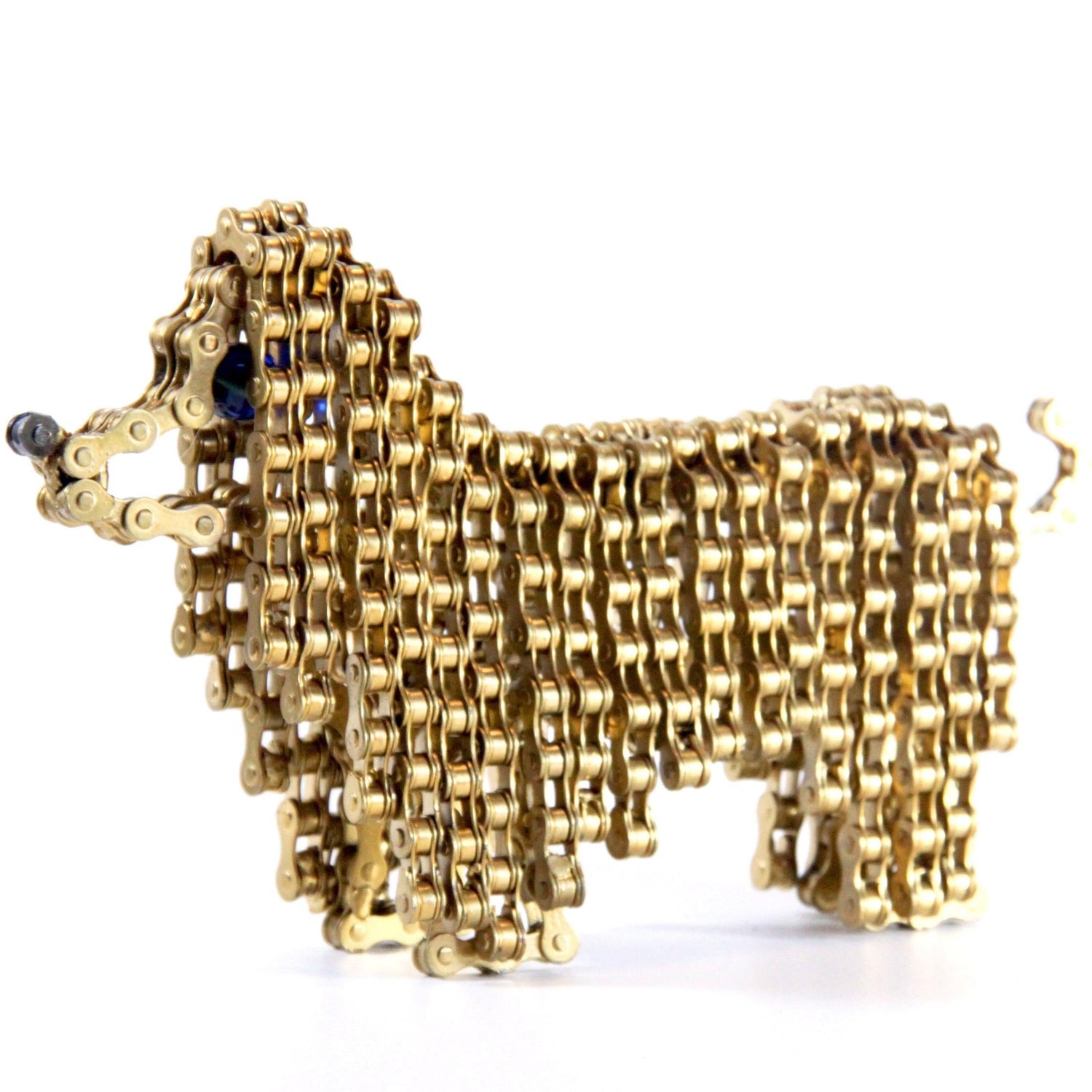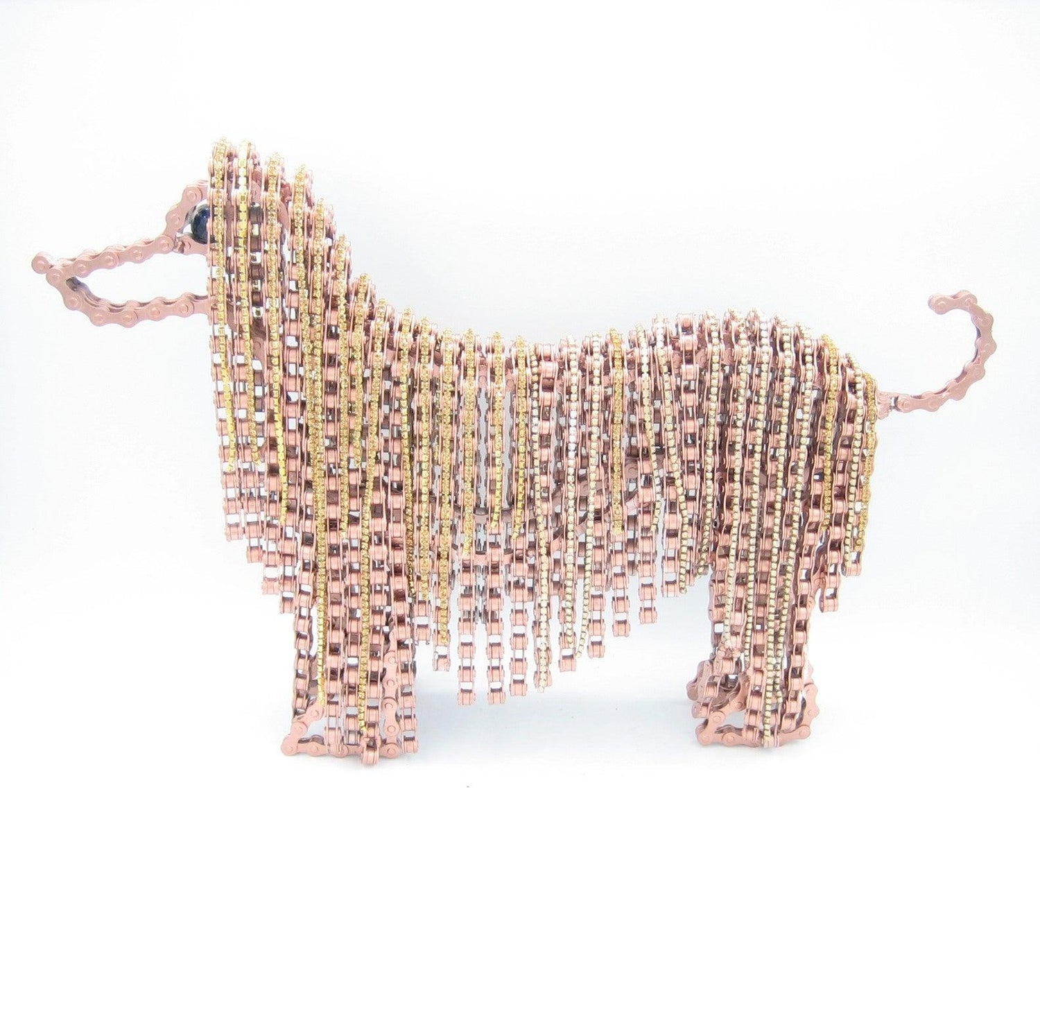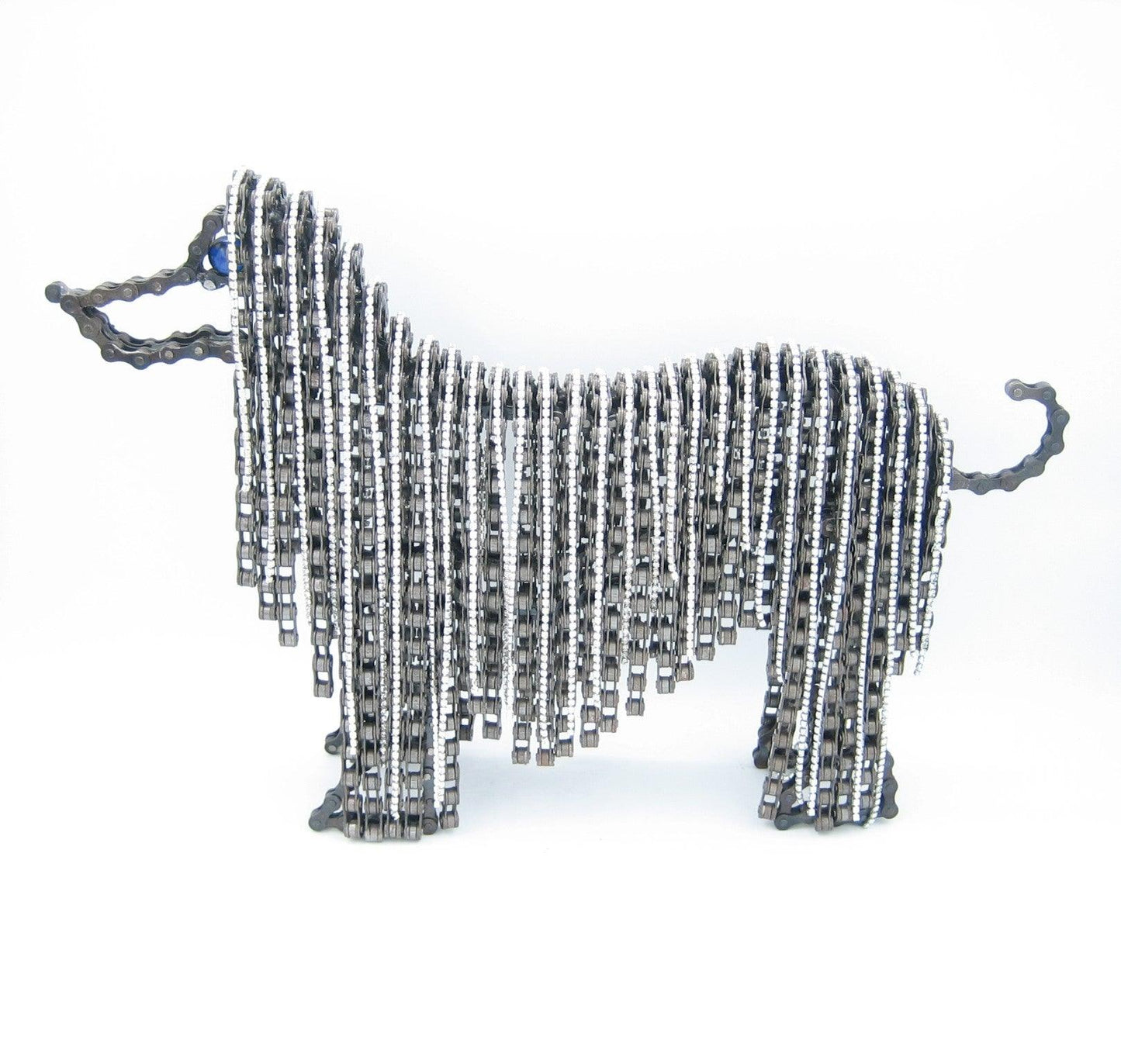 A modern art sculpture of a standing Afghan Hound dog with marble eyes.