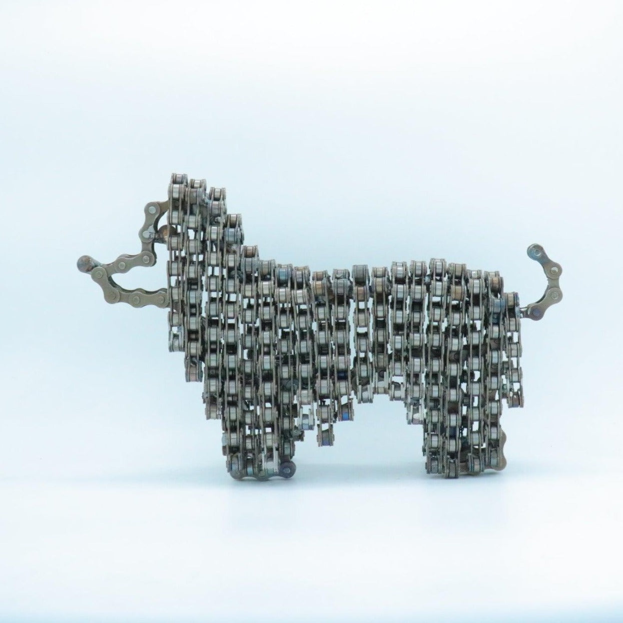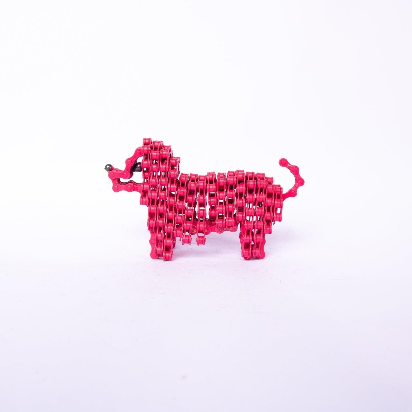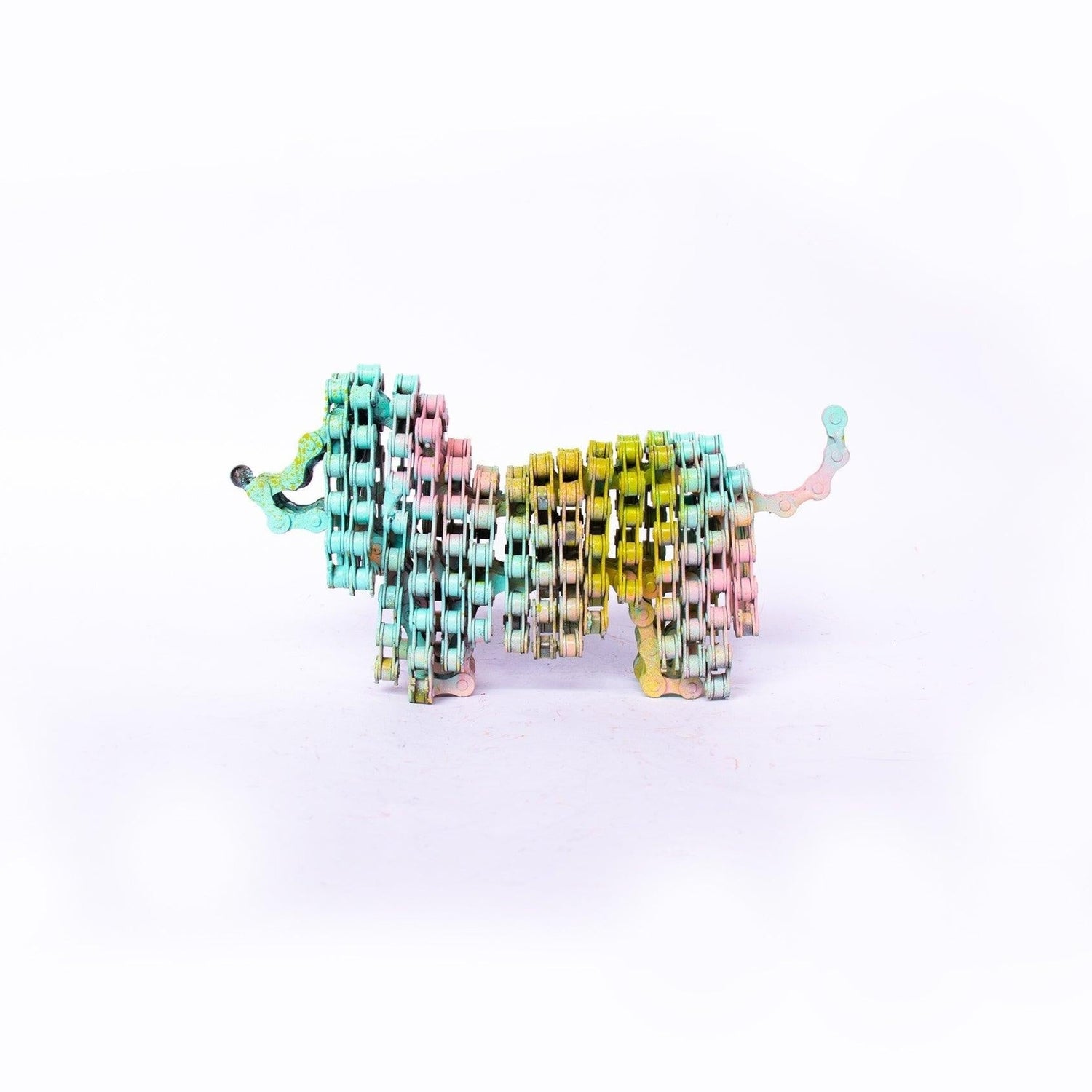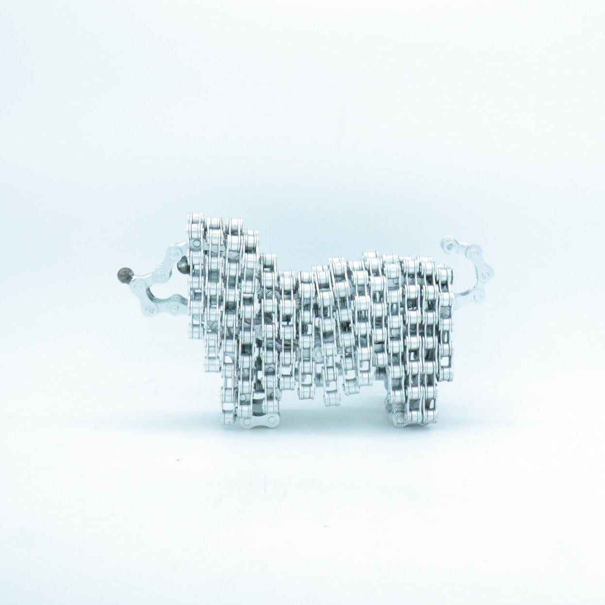 A modern art sculpture of a standing Afghan Hound dog with marble eyes.