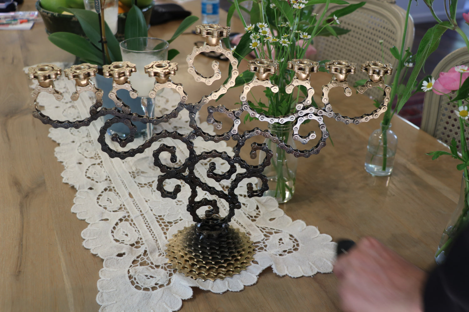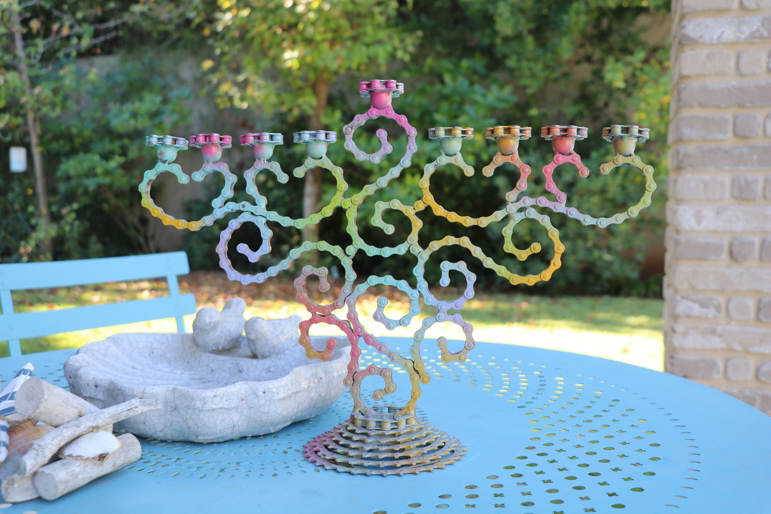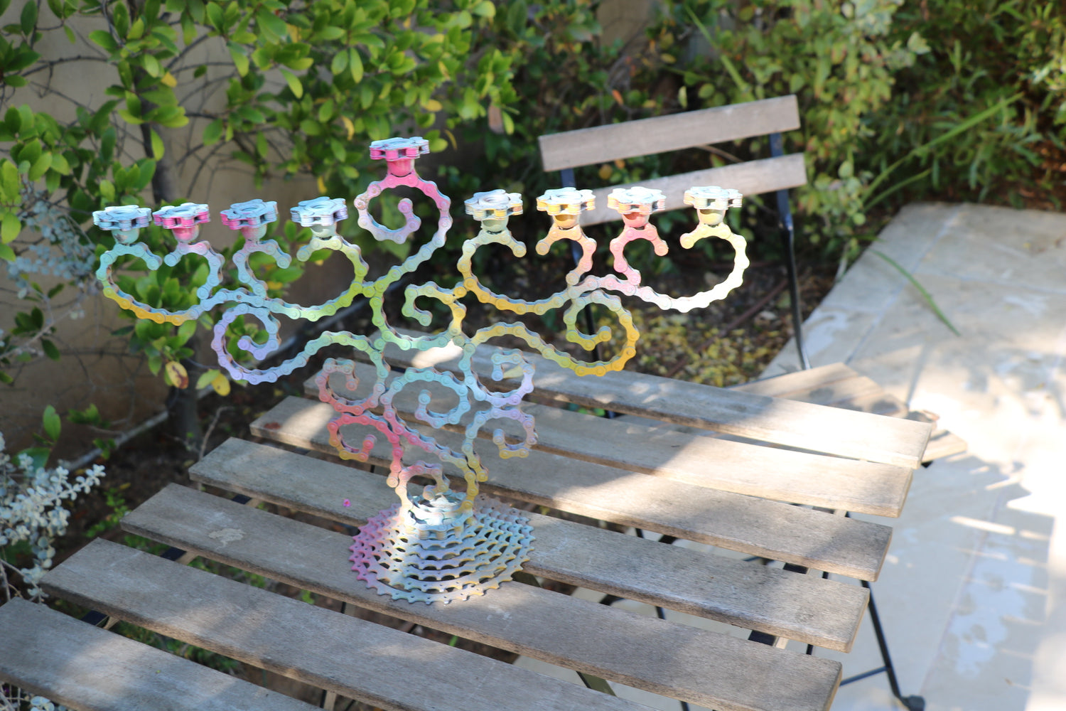 A modern art sculpture of a Menorah.