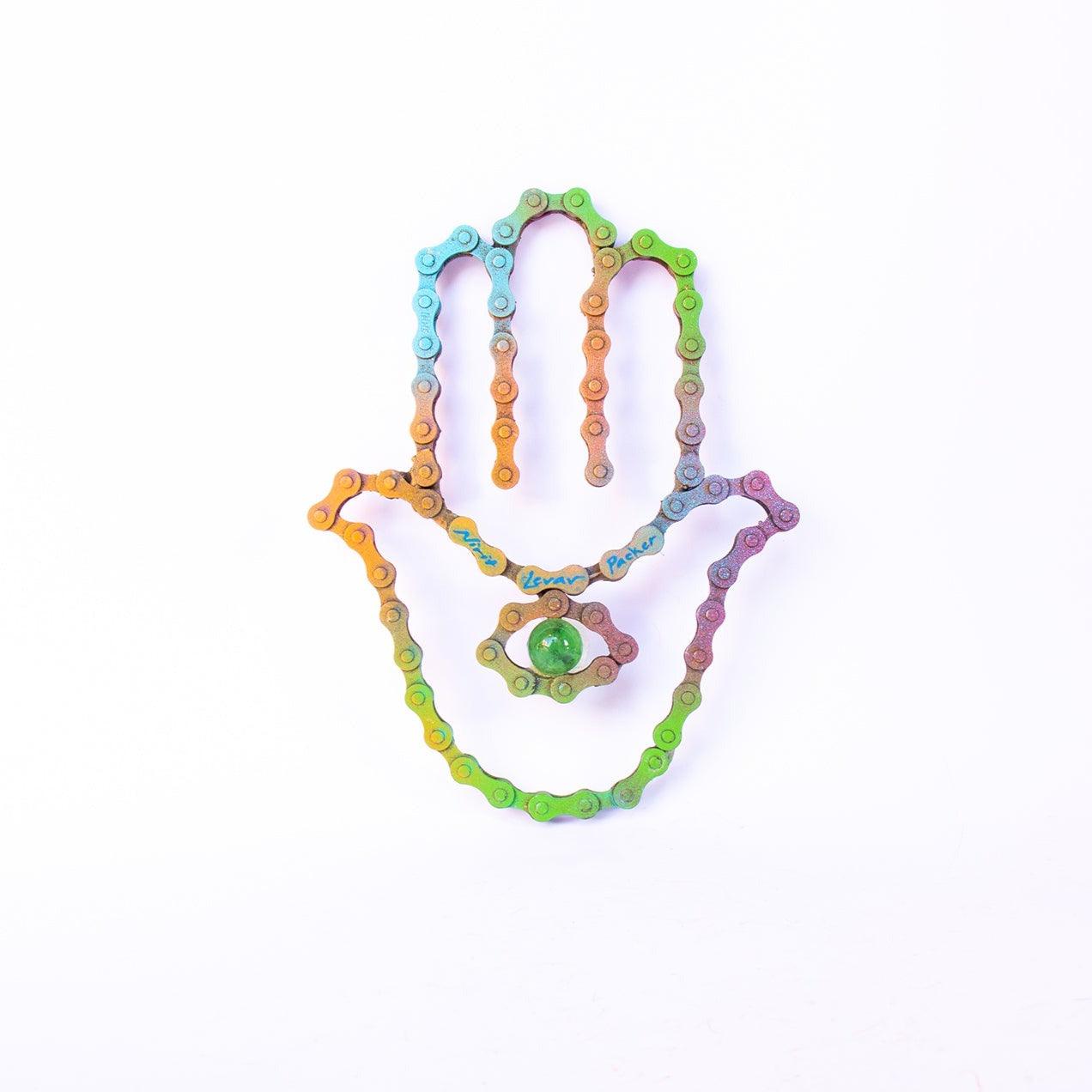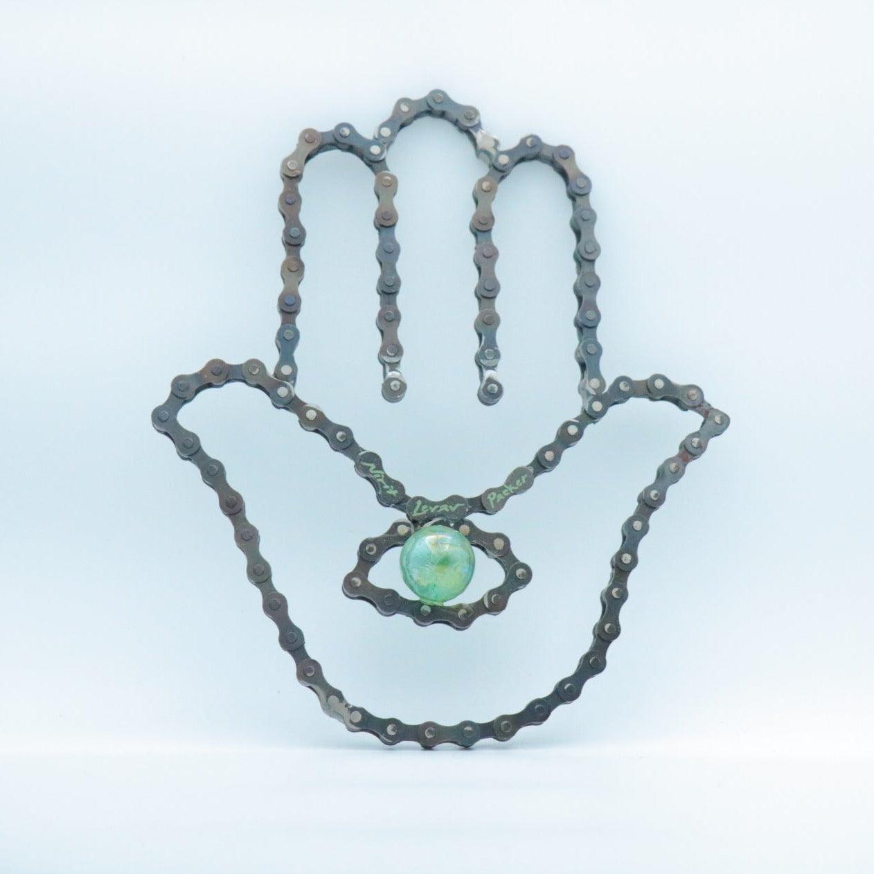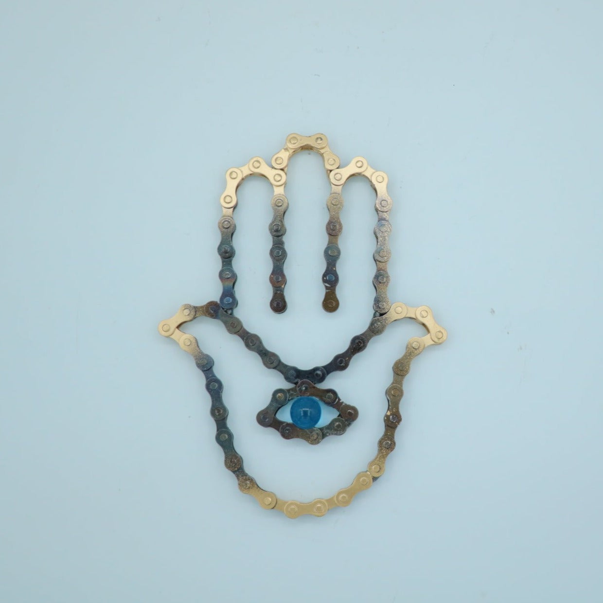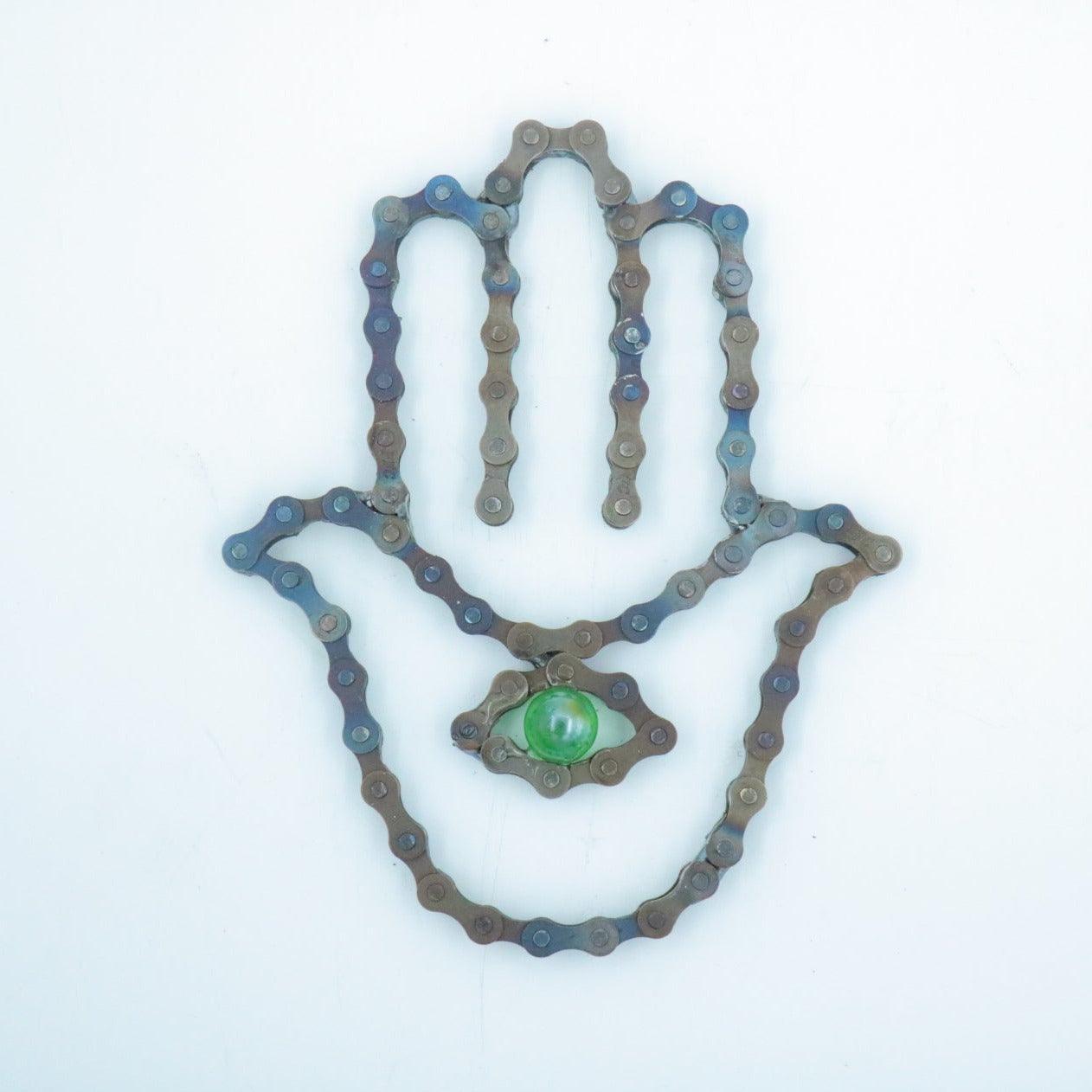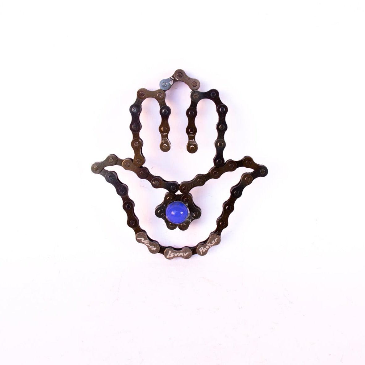 The hamsa sculpture of a metal palm-shaped amulet captures a sense of peace and protection for the home.
